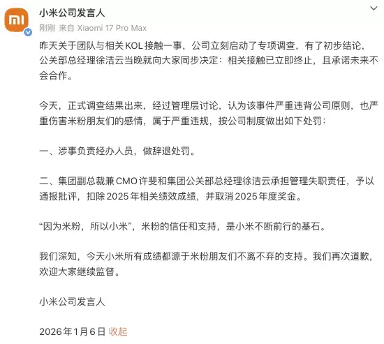小米回应KOL处罚:涉事经办人已被辞退