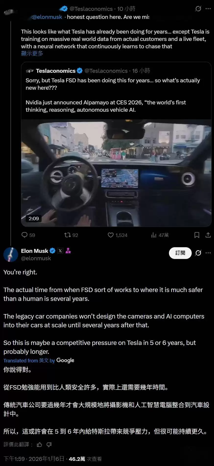 随后,马斯克对一些支持他的观点表示认同。在一条关于“Alpamayo的出现并不意味着FSD失败”的贴文下,他进一步分析称,根据特斯拉竞争对手目前的运营状态来看,Alpamayo大约需要5到6年时间才能成为特斯拉真正的竞争对手,但这一时间跨度也有可能更长。