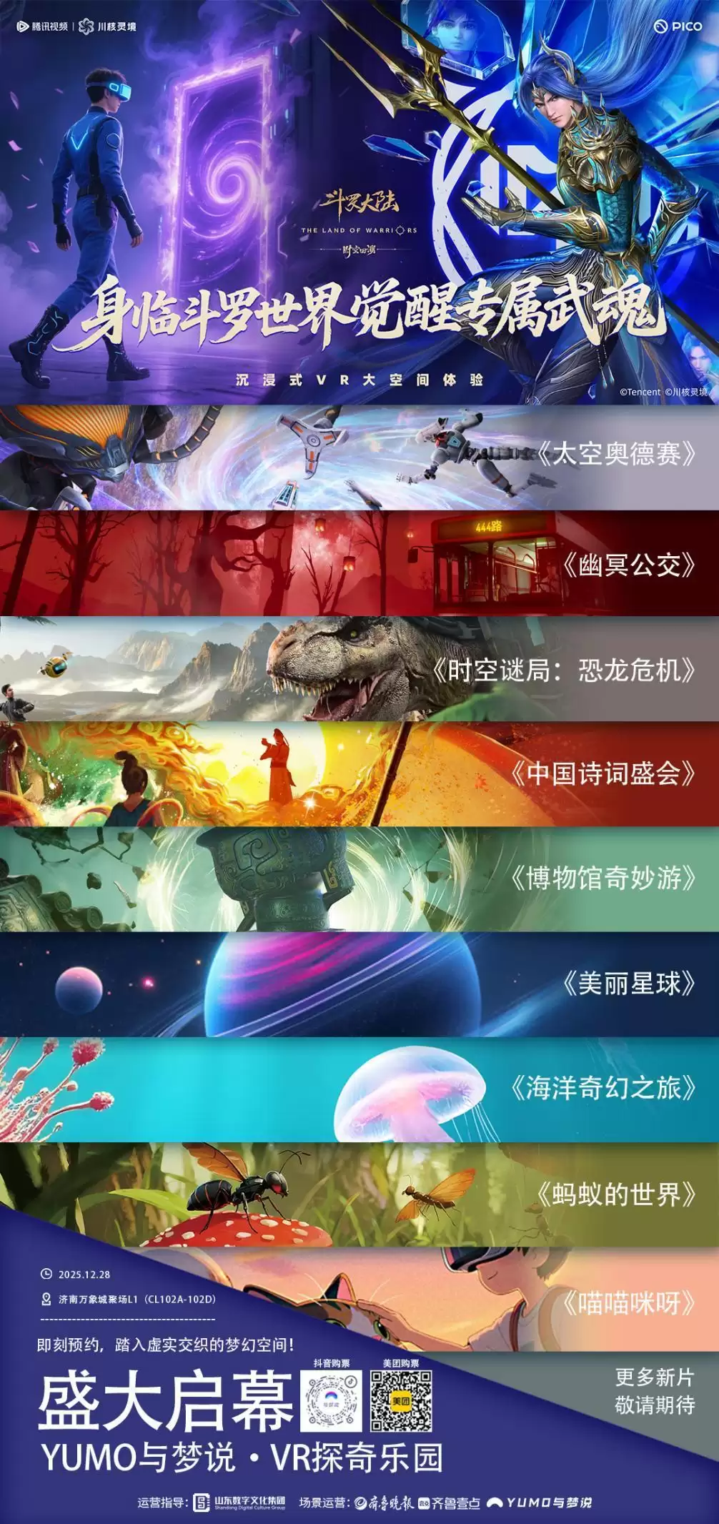 近日,山东数字文化集团旗下元梦·沉浸工作室宣布,全新打造的“YUMO 与梦说·VR 探险乐园”将于12月28日在济南万象城聚会L1层正式开放。作为深耕济南“东西双核”布局后的战略升级之作,这座面积超过700平方米的沉浸式娱乐空间,将以国漫现象级IP《斗罗大陆》为核心,呈现包含10部跨风格VR影片的丰富矩阵,为省城消费者带来“挣脱屏幕、自由行走”的虚实共生新奇体验。
