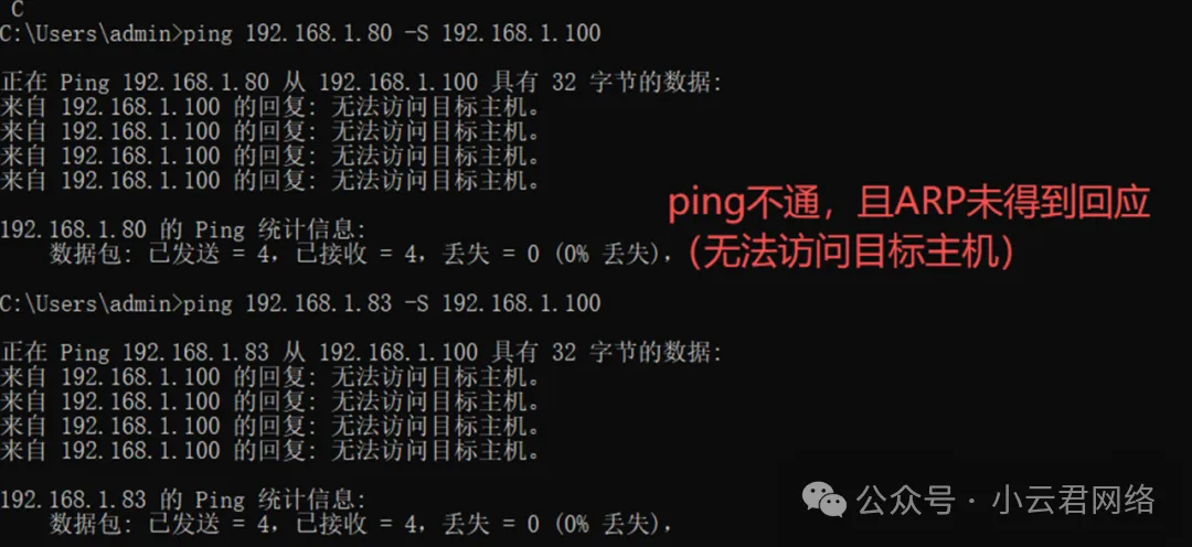 当出现部分设备通、部分不通的情况时,需重点排查IP地址冲突的可能性;检查物理链路连接状态;确认ARP表项学习是否准确。(2)问题2
