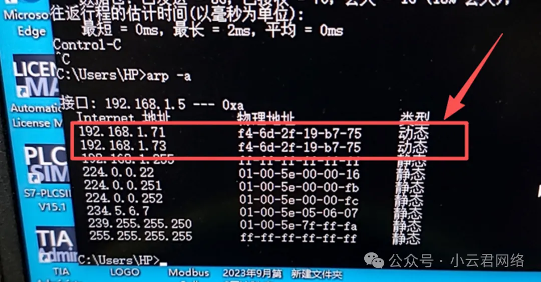 ③ 进一步查看ARP表项,发现这两台PLC设备对应的MAC地址完全相同: