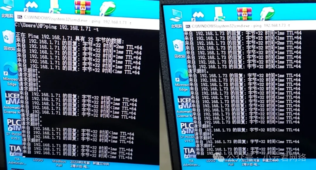 ① 现场测试发现,当PLC1与PLC2两台设备同时接入网络后,对这两台设备执行ping操作丢包严重:
