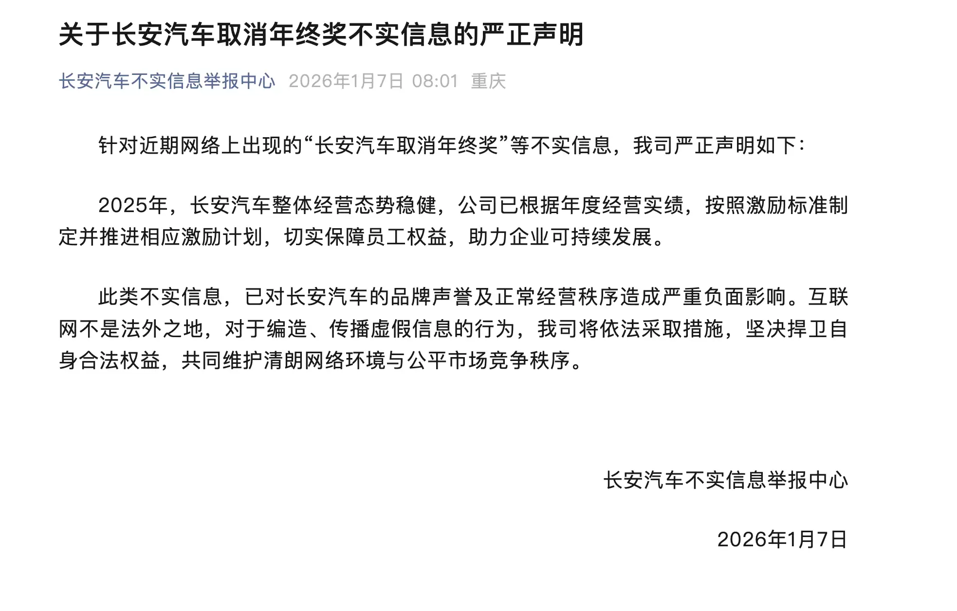 长安汽车近日就网络流传的"取消年终奖"等不实信息作出正式回应。公司通过其最新信息举报平台发布声明指出,相关谣言已对企业品牌声誉及正常运营秩序造成显著损害,公司将依法追究编造、传播虚假信息者的法律责任。