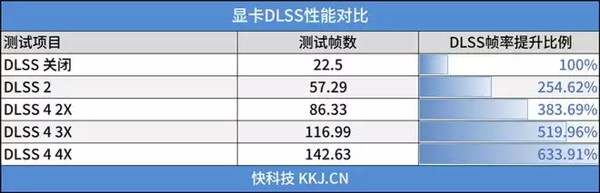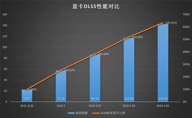 在3Dmark NVIDIA DLSS功能测试中,关闭DLSS 4时帧数为22.5FPS左右,开启DLSS 4 2x之后帧数上升为86.33FPS,开启DLSS 4 3x之后帧数上升为116.99FPS,开启DLSS 4 4x之后帧数上升为142.63FPS。
