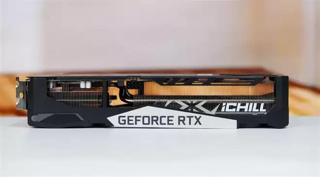 映众RTX 5060 Ti 16GB超级冰龙显卡顶部全貌,可以看到它的散热器厚度达到了三槽的规格,巨大的镂空可以直接看到内部的散热鳍片和穿插其中的热管。散热器正面的银色"补丁"也延展到顶部,印有"Geforce RTX"字样和冰龙"iCHILL"字样。