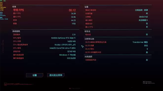 在《赛博朋克:2077》中,我们使用"光线追踪:超速"预设,并在DLSS中选择Transformer模型,DLSS超分辨率使用默认的自动,在4K分辨率下,运行自带的性能测试。