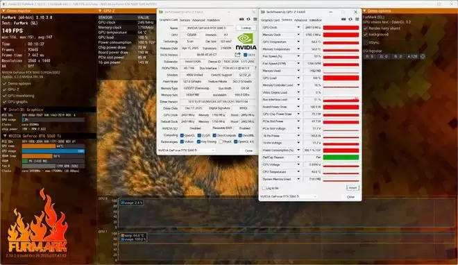 我们使用Furmark对映众RTX 5060 Ti 16GB超级冰龙显卡进行10分钟的烤机,室温约21度,GPU功耗稳定在190W,核心频率2497MHz,温度64.1度,风扇转速约1800RPM。