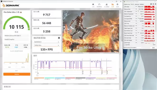 我们在3Dmark测试时,也记录了GPU的工作频率,在更接近真实游戏场景中,映众RTX 5060 Ti 16GB超级冰龙显卡的核心频率最高加速超过2.9GHz,最高功率释放甚至没有完全吃满190W,温度和风扇都略低于烤机时的状态。