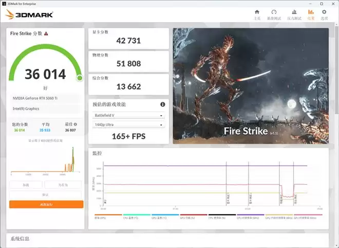 在3DMark的Fire Strike(DX11+1080P渲染分辨率)测试中,总成绩为36014,其中显卡分数为42731。