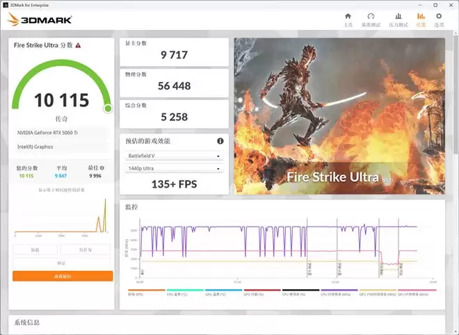 在3DMark的Fire Strike Ultra(DX11+4K渲染分辨率)测试中,总成绩为10115,其中显卡分数为9717。