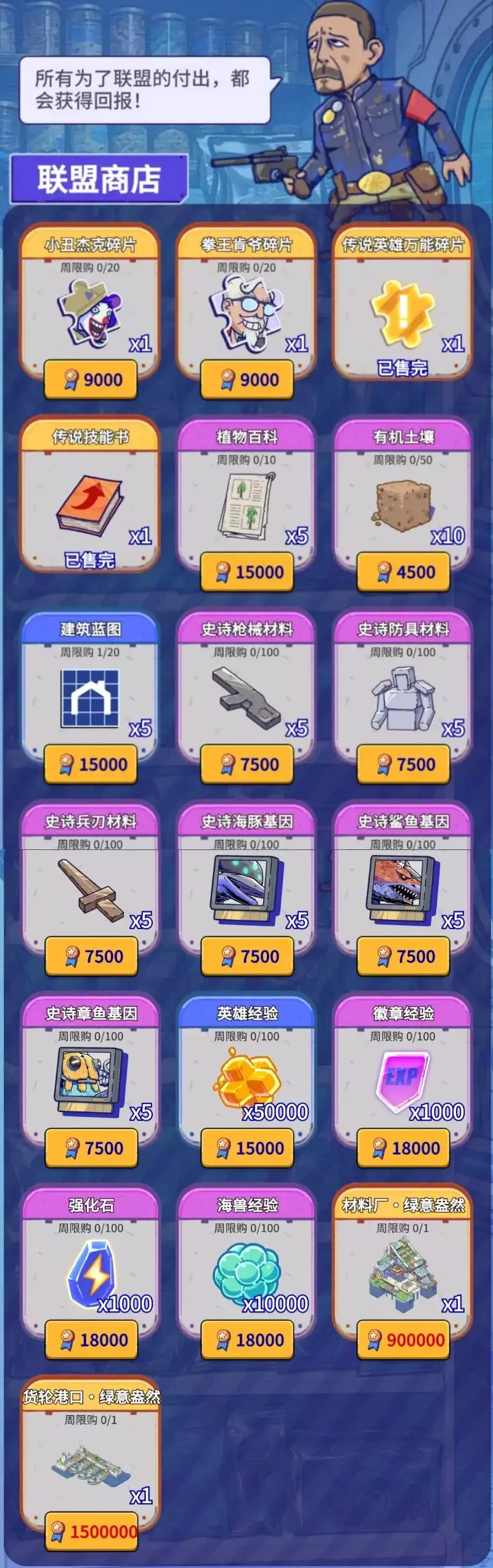 《疯狂水世界》联盟商店每周更新时,优先兑换【传说万能碎片】与【传说技能书】。积攒功勋后,即可用来兑换底部两款价值68元的限定皮肤(S1赛季任务完成即可免费获取)。至于小丑等英雄碎片,若非培养目标则不推荐;植物百科与建筑蓝图可按需换取。