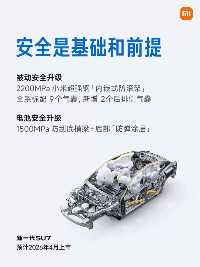 新一代小米 SU7 用上了 2200MPa 的超强钢来构建「内嵌式防滚架」,并把全车气囊数补齐到了 9 个,增加了后排侧气囊,而且是全系标配。针对纯电车最脆弱的底部,小米新增了 1500MPa 的防刮底横梁和底部「防弹涂层」的设计。