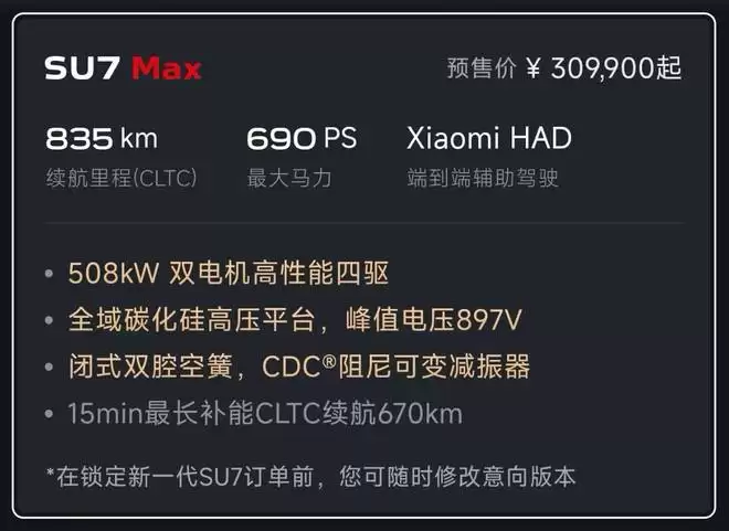 目前新车的小订已经开启,意向金 1000 元,针对那些锁单未交付的老用户,小米还给出了限时升级和保留购置税权益的方案。