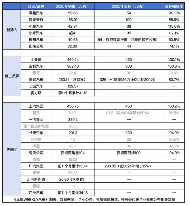 2025年部分车企销量及目标(图/《凤凰WEEKLY汽车》)