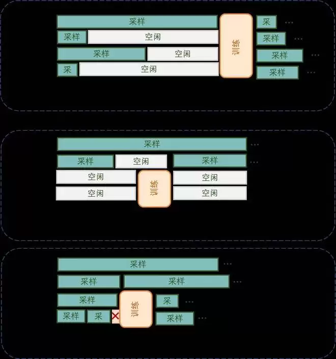 异步分离方案通过静态分配专用的 rollout GPU 和 training GPU 实现流水线并行。虽然理论上能够缩短单轮迭代时间,但引入了严重的 "双边空泡" 问题。在 rollout 侧,短样本快速完成后,rollout GPU 进入闲置状态等待长尾样本执行完毕;在 training 侧,训练任务完成后需要等待新一轮 rollout 数据,training GPU 同样处于闲置状态。使得理论上的并行优势在实际运行中大打折扣。