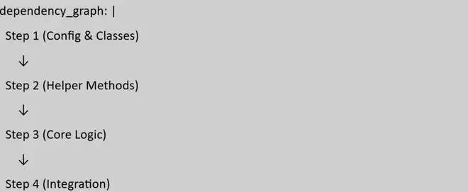 规划实施步骤: 规划的核心目标是将 Section 5 中的方法拆解为依赖有序的小步骤。我们首先分析每个方法的 deps: 字段,识别底层 helper 方法和高层 orchestration 方法之间的依赖关系,绘制出完整的依赖图。在拆解步骤时,我们遵循 "每步越小越好" 的原则,通常一个 Step 包含 3-5 个相互关联的方法,避免单个 Step 包含超过 10 个方法。步骤的排序遵循依赖关系:Step 1 通常是基础设施(配置、常量、基础类),Step 2 到 Step N 按照从底层到高层的顺序排列,最后一个 Step 负责集成和端到端测试。每个 Step 都定义清晰的验证点和测试用例覆盖,确保可以独立验证和方便回退。