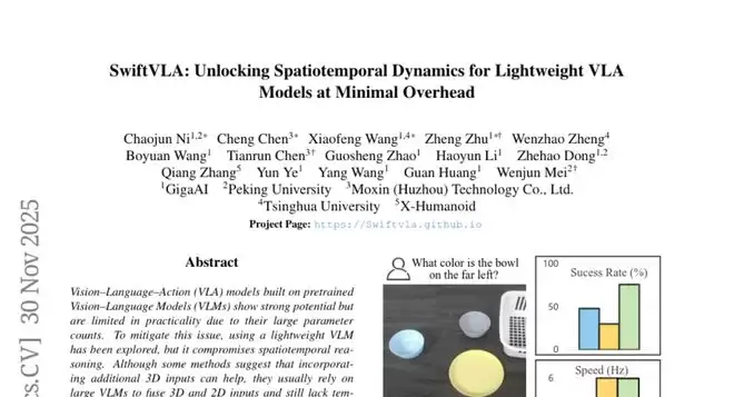 A:SwiftVLA是由GigaAI公司联合多家机构开发的轻量化机器人控制系统,它的核心能力是让小型机器人具备强大的空间感知能力。该系统只用4.5亿个参数就实现了与35亿参数大型系统相媲美的性能,同时运行速度提升18倍,内存占用减少12倍。