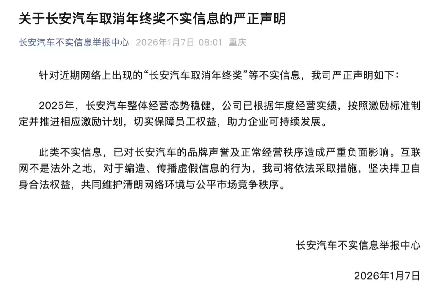 长安汽车近日通过其官方公众号"长安汽车不实信息举报中心"发布声明,针对近期网络上流传的"长安汽车取消年终奖"等虚假传闻作出了正式回应。公司指出,这类不实信息已对其品牌声誉及正常运营造成了显著的负面影响。
