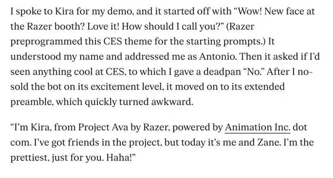 国外的一个记者在展会上试着与 Kira 交流,据他说,Razer 为 CES 预设了 Kira 的开场白:「哇!Razer 展台上出现了新面孔?太棒了!我该怎么称呼你呢?」