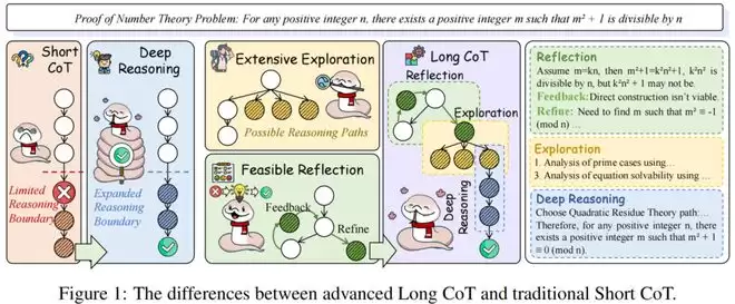 长思维链,有三大关键特征: 深度推理、广泛探索和可行的反思。