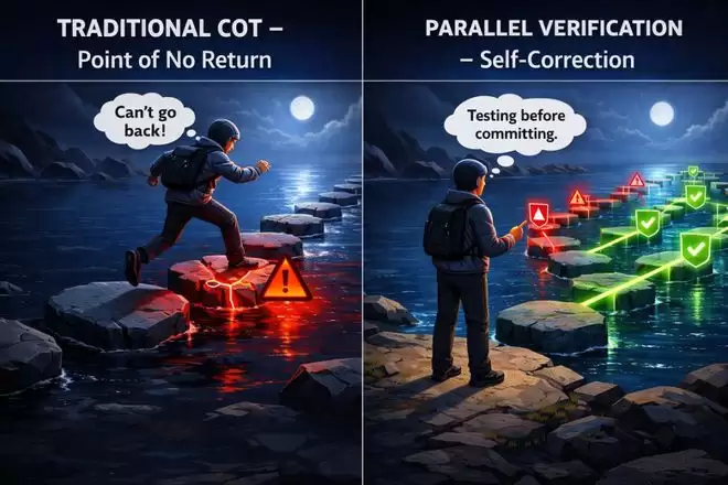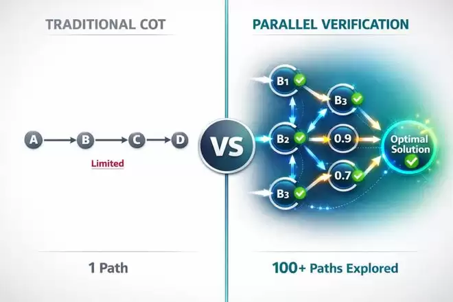 传统的CoT(思维链)是按步骤顺序「提交」的,只要其中一步出错,后面就全盘皆输。