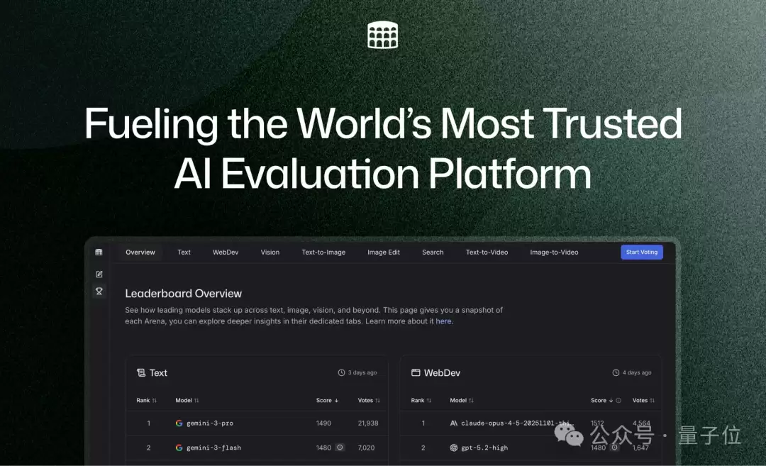 在短时间内不仅累计了覆盖文本、视觉、网络开发等跨模态的5000万张投票,完成了400余种开放及专有模型的评估,还产出了覆盖文本、多模态、专家及职业等多个类别的14.5万个开源战斗数据点。
