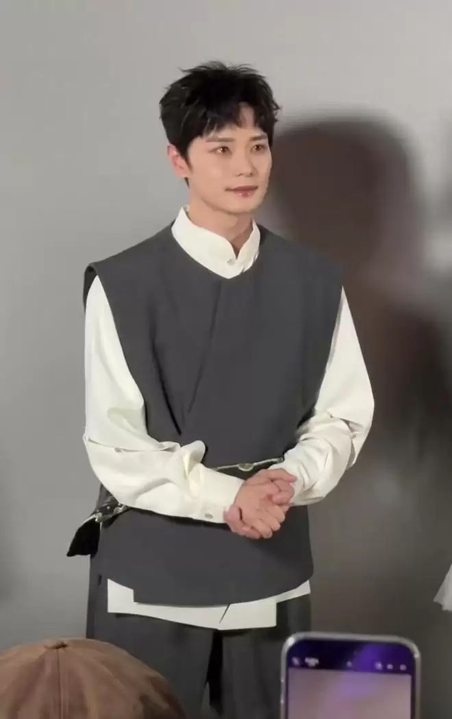 当天,曹骏的穿搭风格很基础,上半身剪裁很有设计感的白衬衣配上灰色马甲,下半身搭配灰裤子,低调又得体。