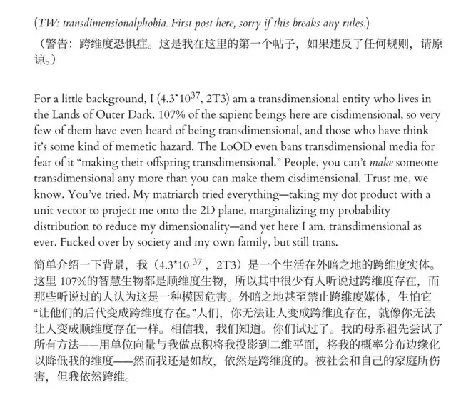 另外,他还分享了自己写的一篇短篇科幻小说,讲的是一个遥远星球中的跨纬度生物在职场中遭遇的歧视。