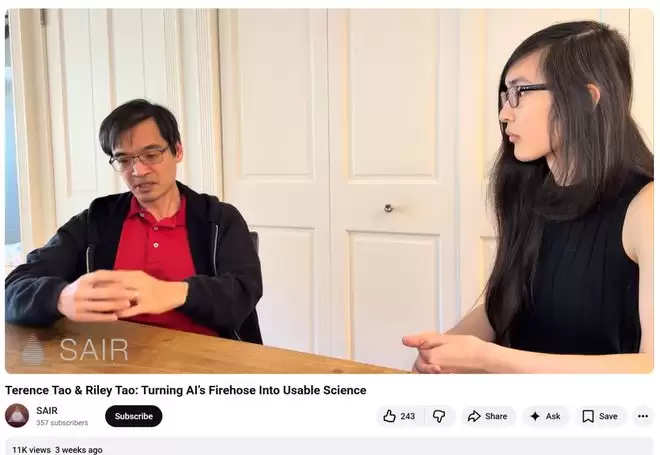 事情是这样的:三周前,在一个SAIR频道的Youtube节目中,陶哲轩和自己的儿子Riley Tao一同出镜,就AI如何与人类合作、加速科学进步展开对谈。