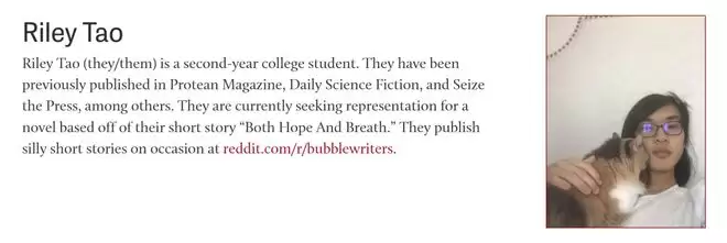 在另一个 上有更详细的介绍:Riley Tao正希望推广的小说,是青少年奇幻题材,讲述一名跨性别高中生发现自我身份的故事。
