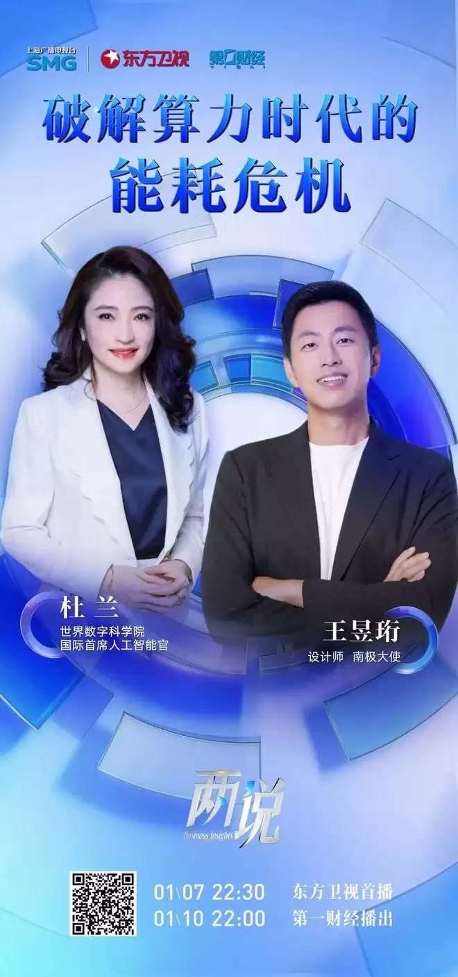 近日,世界数字科学院国际首席人工智能官杜兰,与拥有“鬼才之眼”的设计师、南极大使王昱珩,进行了一场跨界对谈。一位是洞察技术趋势的产业推动者,一位是关注地球健康的自然守护者,他们共同将目光投向了算力时代的能耗危机。敬请关注今晚22:30,东方卫视《两说》新年开篇之作。