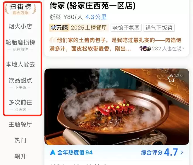 扫街榜1.0阶段像一位理科生,通过各种数据维度提炼优质供给。不同数据权重构成了许多次级榜单,有综合多数据、面向中小商家的榜单“烟火小店”,有专程前往的“轮胎磨损榜”,亦有回头客权重更高的“多次前往”等。
