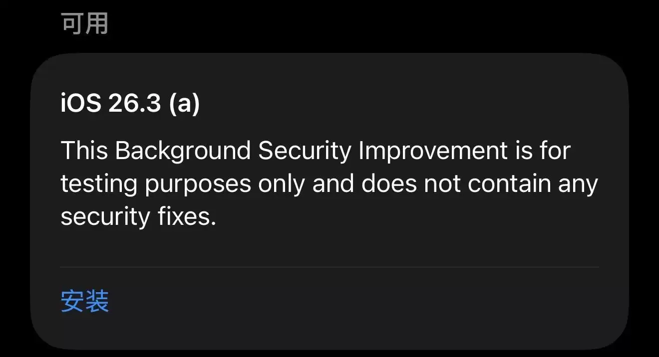 需要注意的是,苹果今天推送的这次“26.3(a)”后台安全改进并不包含任何实际的漏洞修复内容。苹果也明确表示,这次更新的目的是进行功能验证。