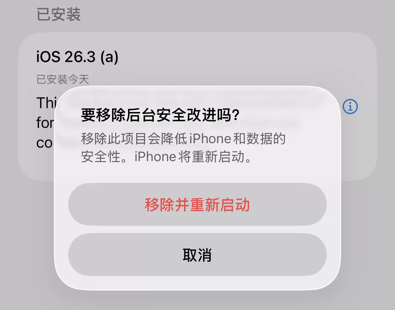 安装过程中iPhone会快速重启,安装后,也可以选择手动将这次后台安全改进移除。