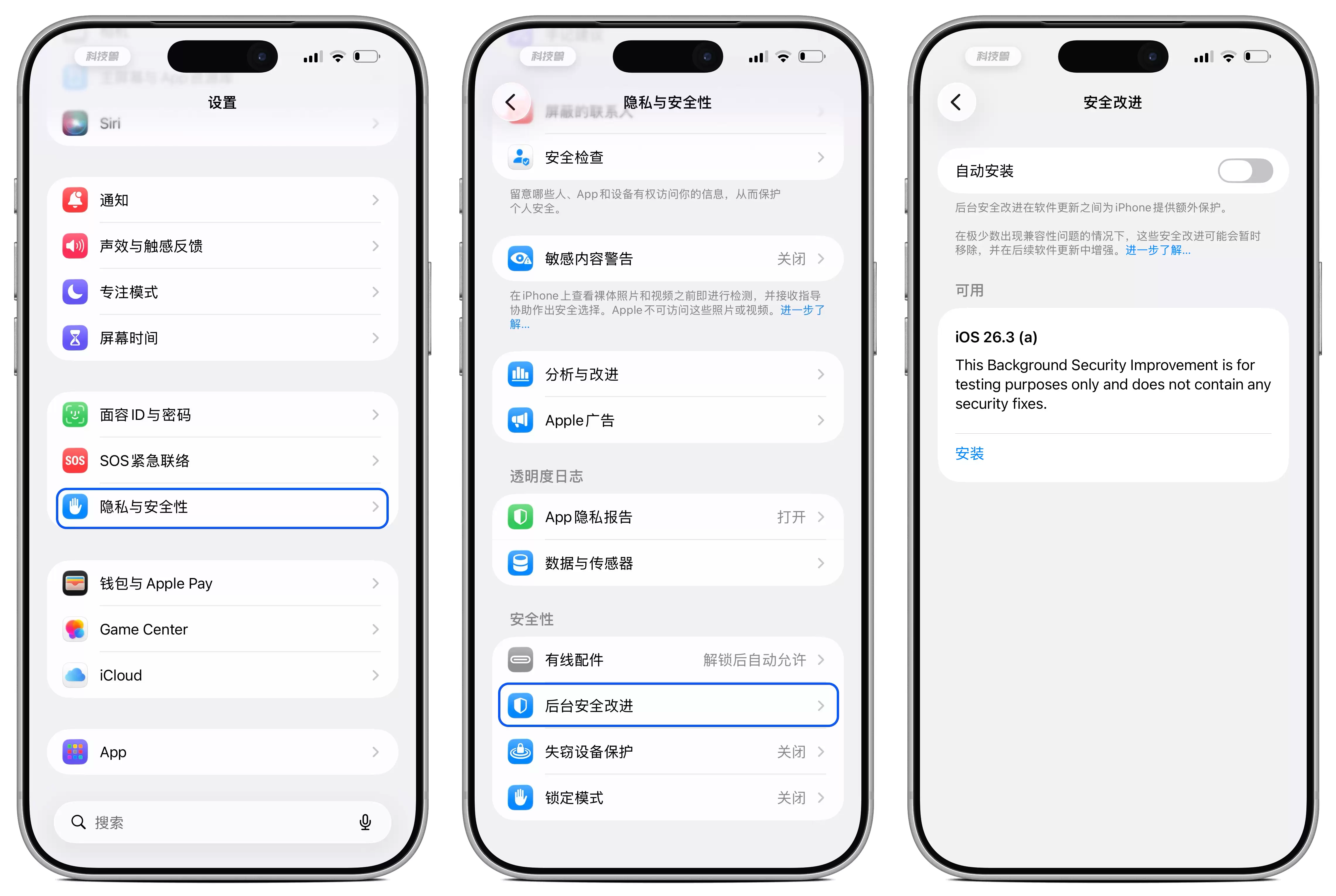 iPhone用户可以进入“设置-隐私与安全-后台安全改进”查看相关选项。如果此前已经开启了“自动安装”功能,当后台安全改进推出时,系统会在后台自动完成更新。