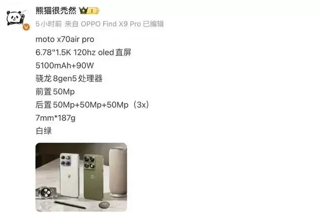 在此之前,博主@熊猫很禿然 的一份爆料中也提到了这款moto X70 Air Pro的详细信息。
