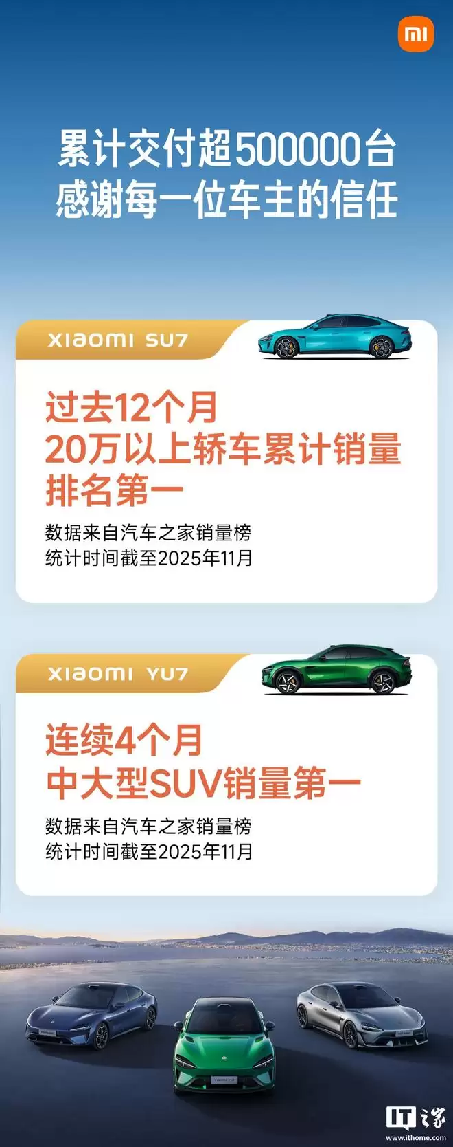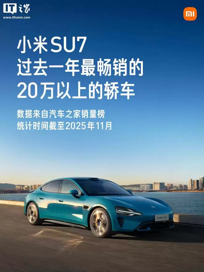 IT之家此前报道,在2025年12月31日,小米汽车通过官方微博发布了“2025年终总结”,其中提到小米SU7在截至当年11月的过去12个月内,成为20万元以上轿车累计销量冠军。而小米YU7则连续4个月蝉联中大型SUV销量榜首。