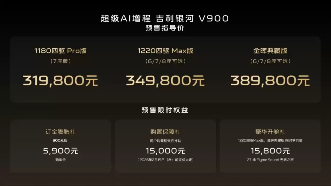 吉利银河V系列首款中大型家庭旗舰MPV——银河V900近日正式开启预售,共推出3个版本,预售价格区间为31.98万元至38.98万元。新车以“空间平权”为设计理念,围绕家庭出行的核心需求,在空间、舒适性、安全性及智能化方面实现全面突破,为豪华家庭MPV市场注入新活力。
