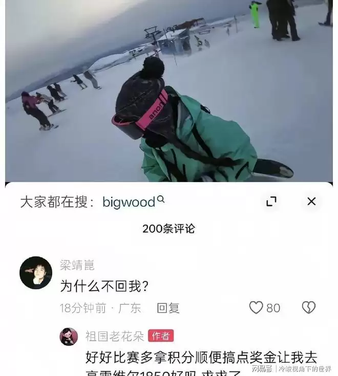 梁靖崑老婆奚美丽在社交平台发布滑雪视频又美又飒。梁靖崑留言:“不知道啥地方,但你视频挺搞笑。”可能是评论区留言太多了,奚美丽没有及时回复。梁靖崑马上跟评:“为什么不回我。”老婆幽默回复:“好好比赛多拿积分顺便搞点奖金让我去高雪维尔1850好吗求求了。”