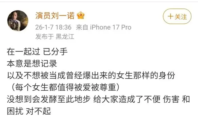 1月4日,一个叫刘一诺的女演员在微博更新了晒卡地亚的内 容,文案为:“你送我的礼物,我不想你也送给过别人。”