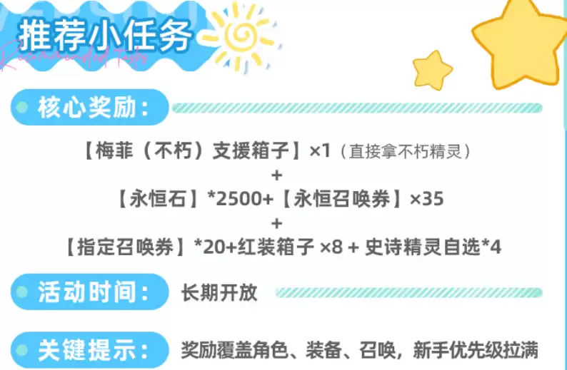 "推荐小任务"属于常驻引导型成长系统,全程零难度门槛。整套任务链共提供2500颗永恒石,同时附赠35张永恒召唤券、20张指定召唤券、8个红装宝箱及4个史诗精灵自选权。任务内容均围绕基础玩法展开,如通关普通副本、提升角色等级、激活技能树等,基本与新手流程同步推进,自然完成率极高。入口位于主界面右侧功能栏,进度实时可见,建议优先完成以快速解锁多重资源。