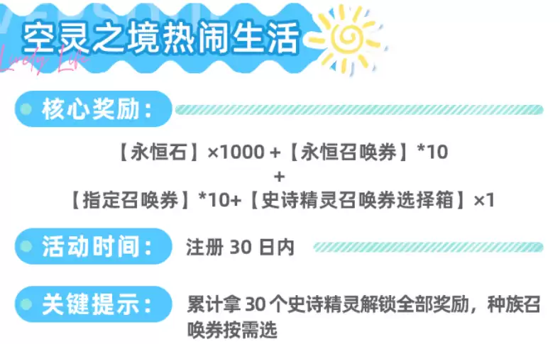 "空灵之境热闹生活"活动限时30天(自注册日起计算),达成累计收集30个史诗精灵的目标后,即可解锁全部奖励,包括1000颗永恒石、10张永恒召唤券、10张指定召唤券及1个史诗精灵召唤券选择箱。该目标在常规推图与日常抽卡节奏下可自然达成,无需额外刷取,奖励结构均衡,兼顾资源、抽卡与定向培养需求,综合价值突出。