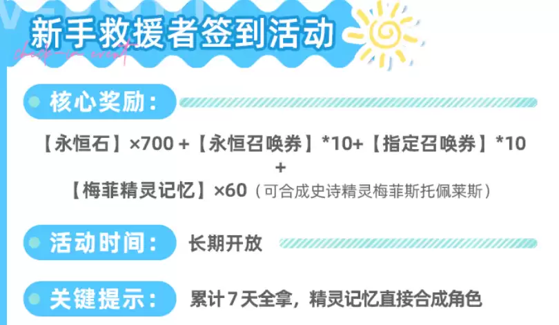 当前开放的双签到机制覆盖不同时间节点:其一是"新手救援者签到",连续签满7日可获得700颗永恒石、10张永恒召唤券及10张指定召唤券;其二是"上线纪念签到",持续14日,总计发放2400颗永恒石与20张指定召唤券。两项叠加后共得3100颗永恒石,折合约10张永恒召唤券的价值,属于低投入高回报的固定收益来源。