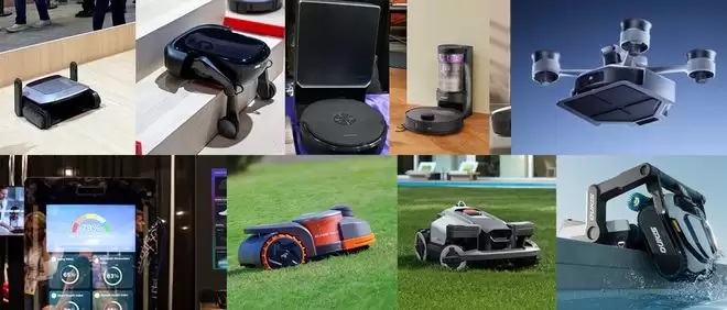 九号科技、石头科技都展示了自家割草机器人,库犸科技新款泳池机器人Spino S1 Pro,能自己从水中升起来充电。