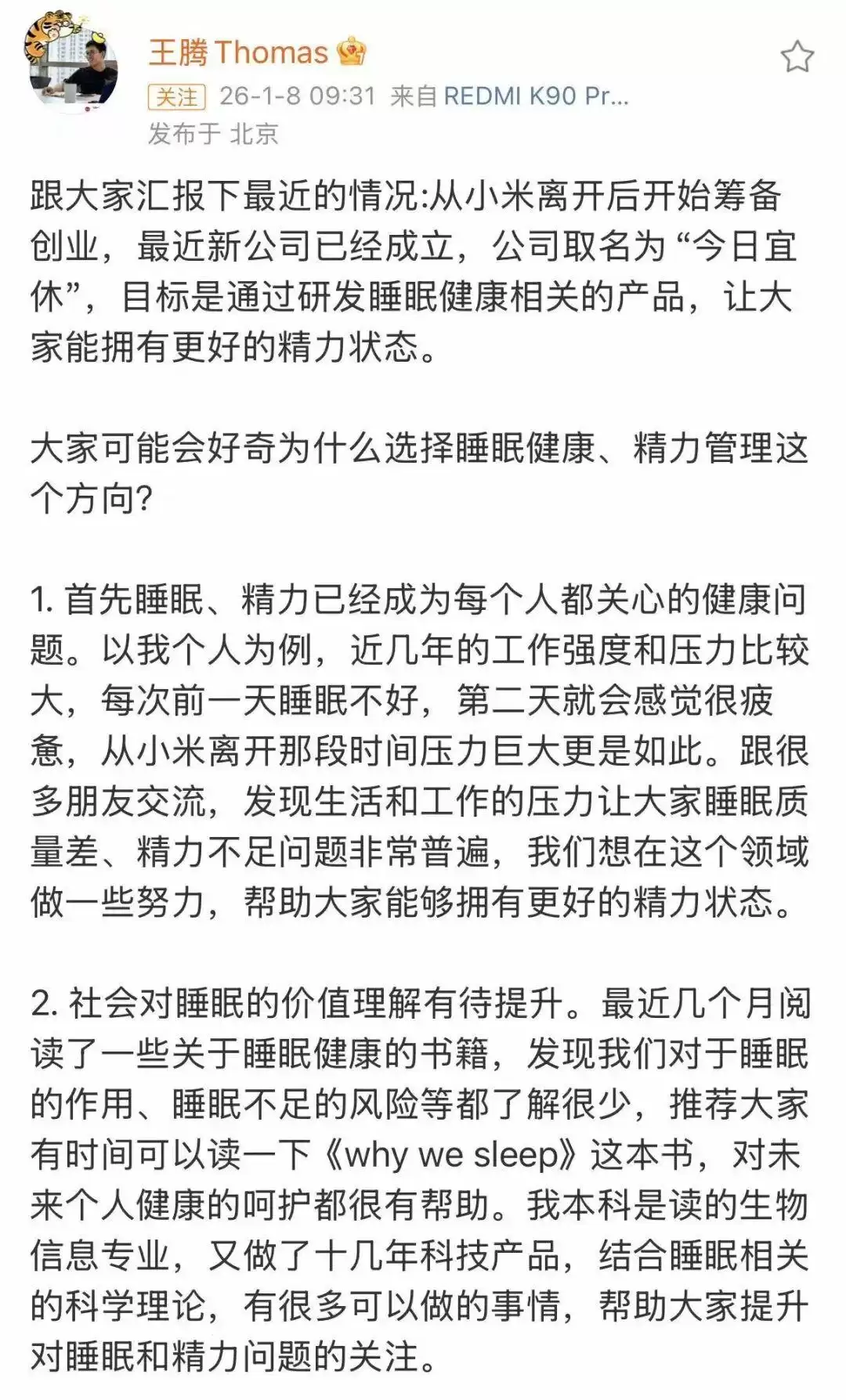 他表示,自从小米离职后,便一直在筹备创业项目。如今,新公司已正式成立,取名“今日宜休”,目标是研发睡眠健康相关的产品,帮助大家改善精力状态。