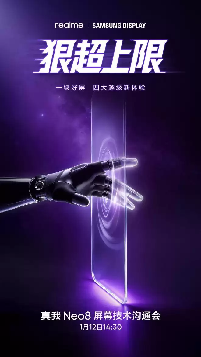 值得注意的是,真我将于1月12日召开真我Neo8屏幕技术沟通会,届时将揭晓更多技术细节。