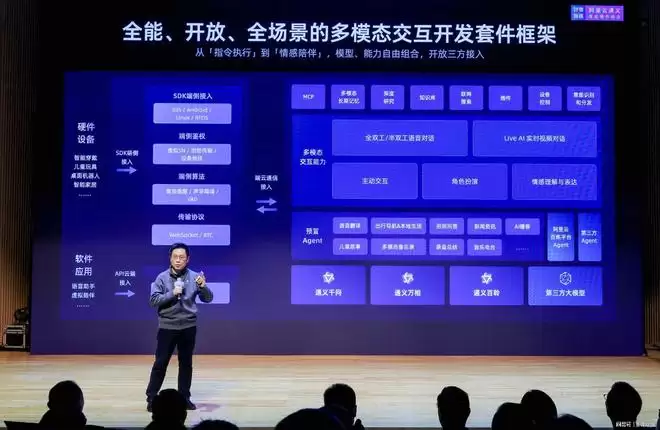 1月8日,在阿里云通义智能硬件展上,阿里云发布了多模态交互开发套件。该套件集成了通义千问、万相、百聆三大基础大模型,并预置了数十款覆盖生活休闲与工作效率提升等场景的Agent和MCP工具。它不仅具备“听懂”与“看懂”的能力,更能进行思考并与物理世界互动,可广泛应用于AI眼镜、学习机、陪伴玩具、智能机器人等各类硬件设备。