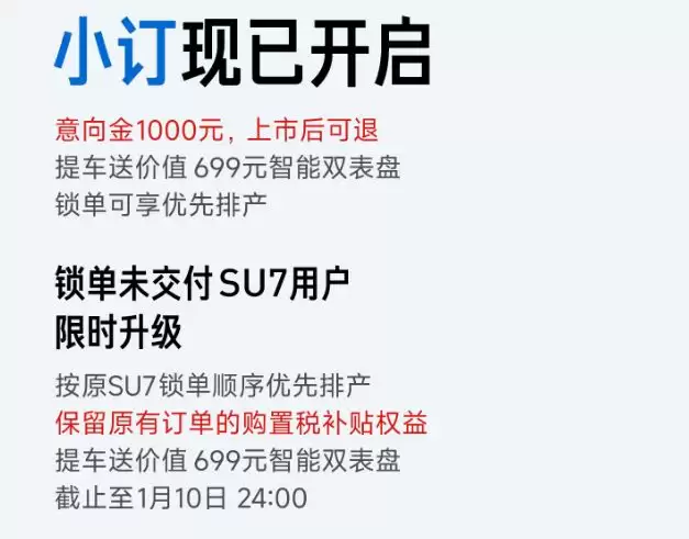 1 新车小订通道现已开启,已下定但尚未锁单的SU7准车主,可限时升级新款。生产安排将依据原SU7订单顺序进行,已下订单的用户将保留原购车权益;