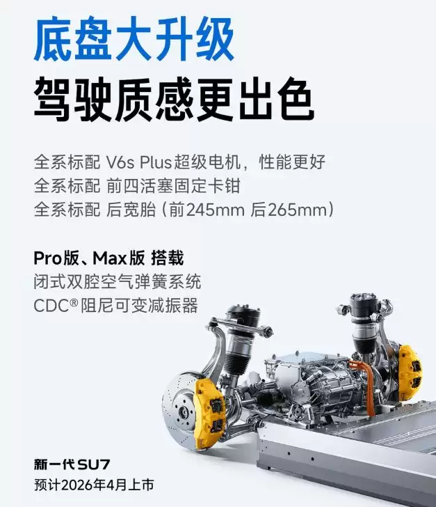 新车全系标配9个安全气囊、2200MPa热成型钢车门防撞梁,以及嵌入式防滚架,并新增了门锁专用后备电源,此项功能在不久前小米的拆车环节中也曾展示。此外,新车还全系标配前窄后宽轮胎(前245mm/后265mm),标配V6s Plus超级电机与前四活塞卡钳,而Pro和Max车型上则标配了空气悬架与CDC减震器。