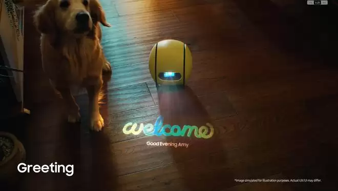 在CES 2024展会上,Ballie以全新的、更圆润、更大的造型亮相,依靠三个轮子滚动。Ballie还配备了一个环形灯,三星播放了一段视频,展示了它作为投影仪的使用。
